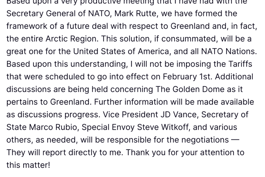 In a in a Truth Social post on Thursday, Trump announced a “very productive meeting” with NATO Secretary General Mark Rutte regarding Greenland and the Arctic Region. The president stated, “Additional discussions are being held concerning The Golden Dome as it pertains to Greenland.”