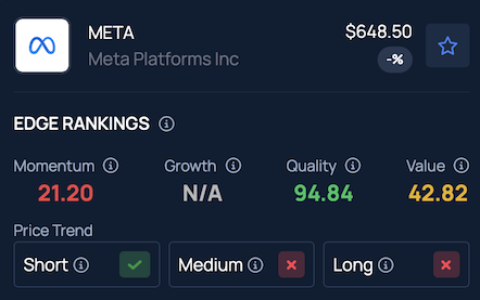 Meta shows a strong short-term price trend but underperforms in the medium and long term, with a weak momentum ranking, according to Benzinga’s Edge Stock Rankings.