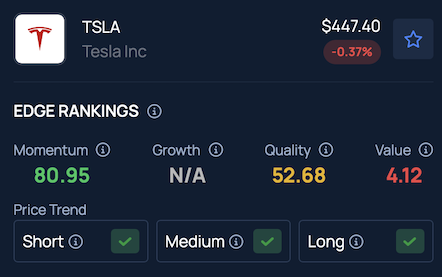 Tesla stock scores high on Momentum in Benzinga’s Edge Stock Rankings, with a favorable price trend in the short, medium and long terms.