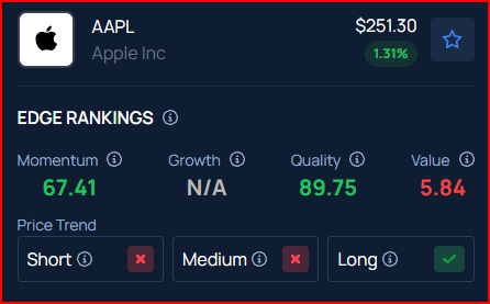 Benzinga’s Edge Rankings place Apple in the 90th percentile for quality and the 67th percentile for momentum, reflecting its average performance. Benzinga’s screener allows you to compare Apple’s performance with its peers.