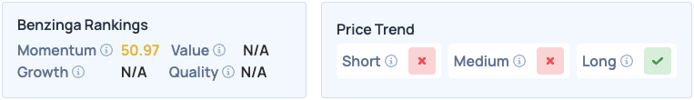 The stock scores poorly in Benzinga’s Edge Stock Rankings, with an unfavorable price trend in the short and medium terms.