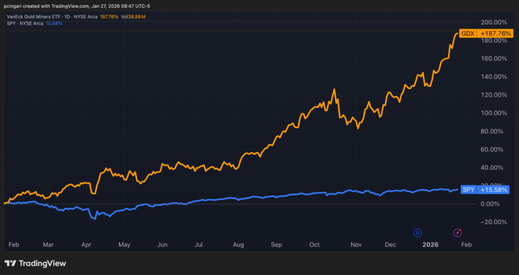 That gap puts gold miners on pace to outperform the broader market by more than 10 times.