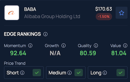 Alibaba stock scores high on Momentum in Benzinga’s Edge Stock Rankings, with a favorable price trend in the short, medium and long terms.