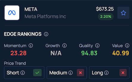 Meta maintains a stronger price trend over the short term but is negative in medium and long terms with a poor Momentum ranking. Additional performance details, as per Benzinga’s Edge Stock Rankings.