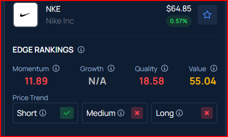 Benzinga’s Edge Rankings place Nike in the 19th percentile for quality and the 55th percentile for value, reflecting its average performance. Benzinga’s screener allows you to compare Nike’s performance with its peers.