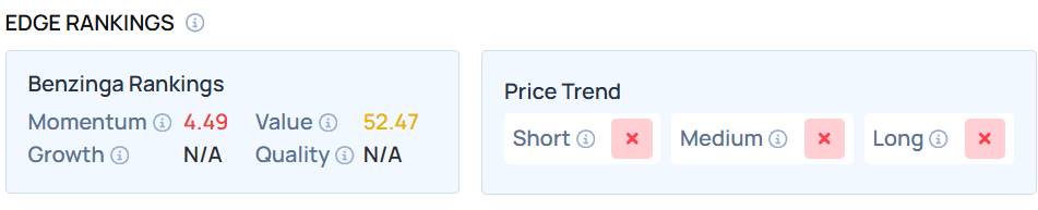 The stock maintains a weaker price trend over the short, medium, and long term with a moderately high Value ranking, according to Benzinga’s Edge Stock Rankings.
