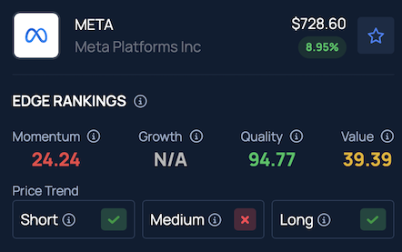 Meta stock ranks low on Momentum in Benzinga’s Edge Stock Rankings, showing a positive price trend in both the short and long term, but a negative trend in the medium term.