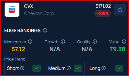 Benzinga’s Edge Rankings place Chevron in the 79th percentile for value and the 57th percentile for momentum, reflecting its mixed performance. Benzinga’s screener allows you to compare Chevron’s performance with its peers.