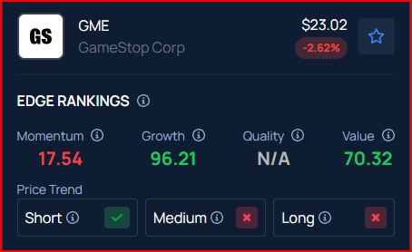Benzinga’s Edge Rankings place GameStop in the 70th percentile for value and the 96th percentile for growth, reflecting its strong performance. Benzinga’s screener allows you to compare GameStop’s performance with its peers.