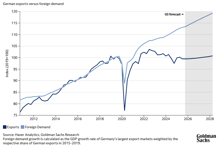 German shipments have grown “significantly” less than foreign demand, resulting in a loss of market share, according to Goldman. Chinese manufacturing has displaced German goods, with the impact of “this competition to continue to restrain exports in coming years,” it said.