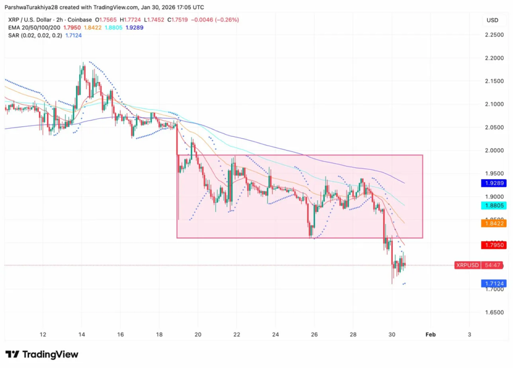 A sustained break below triggers cascading stops and pushes XRP toward $1.60-$1.65.