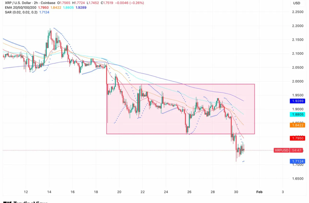 A sustained break below triggers cascading stops and pushes XRP toward $1.60-$1.65.