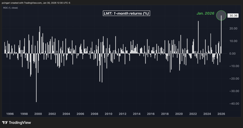 Defense giant Lockheed Martin Corp. (NYSE:LMT) jumped 30%, marking the strongest monthly gain in the company’s history since it began trading in 1995.
