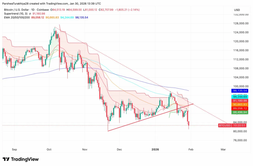 A break below $80,000 triggers panic selling and opens the door to the $75,000-$78,000 range.