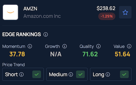 AMZN stock scores high on Quality in Benzinga’s Edge Stock Rankings, with a favorable price trend in the short, medium, and long terms.