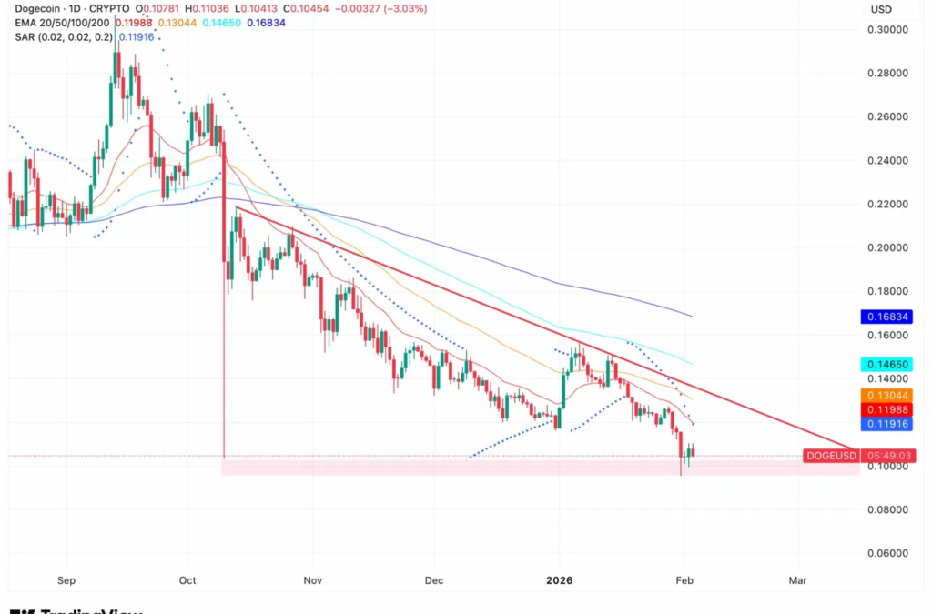 Dogecoin is testing critical $0.10 support—a psychological make-or-break point. A breakdown below triggers panic selling toward $0.08-$0.09.