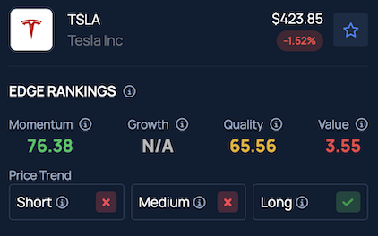 Tesla stock scores high on Momentum in Benzinga’s Edge Stock Rankings, with a favorable price trend in the long term but downward in the short and medium term.