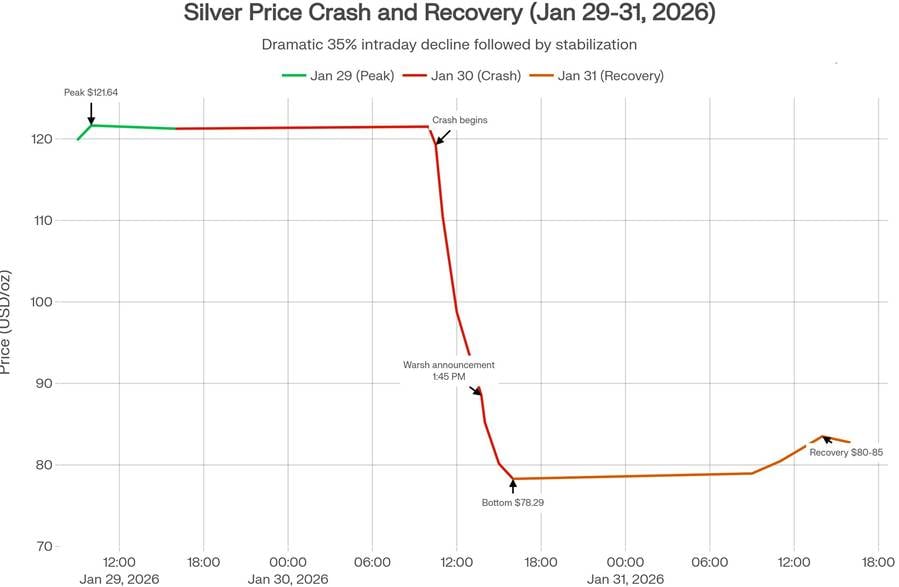 The chart above shows intraday silver prices for January 29-31. Silver peaked at $121.64 on January 29. On January 30, the crash began accelerating around 10:30 AM, dropping to $119.25. By 1:45 PM (when Kevin Warsh’s Federal Reserve nomination was announced) silver had already fallen to $88.50, a 27% decline from the peak. The three hours between crash start and announcement suggests the market dislocations preceded the news event, not the reverse.