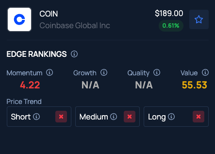 Benzinga Edge Stock Rankings indicate Coinbase stock has a Value in the 55th percentile and a Momentum in the 4th percentile.