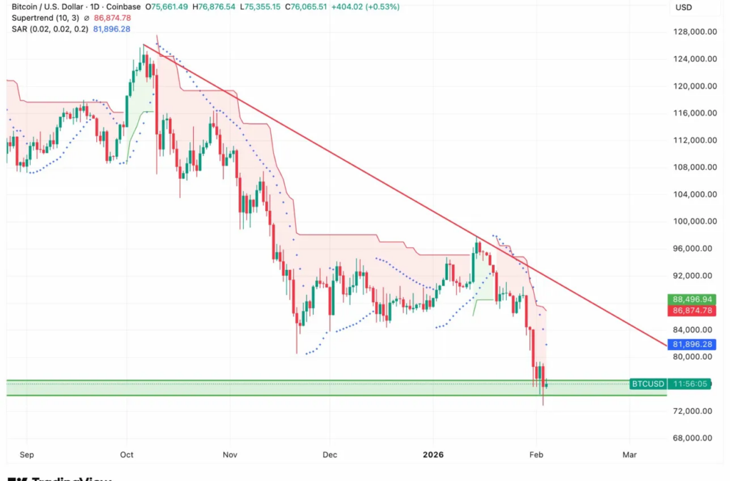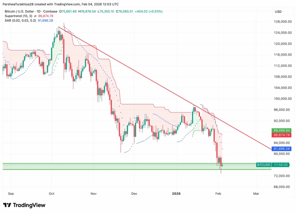 The Supertrend indicator sits at $86,874 in bearish mode, while the Parabolic SAR at $81,896 acts as dynamic resistance.