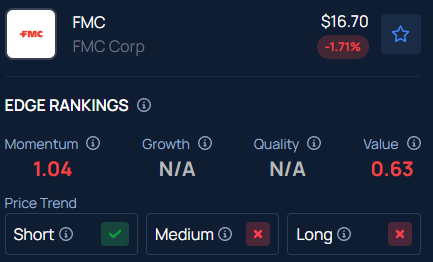 Benzinga’s Edge Stock Rankings indicate that FMC is showing short-term upward movement, along with medium- and long-term consolidation.