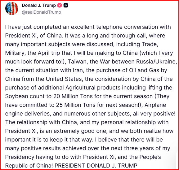 Trump also stated that the discussions included Taiwan, Russia-Ukraine war, current situation in Iran, as well potential oil purchase from the U.S.