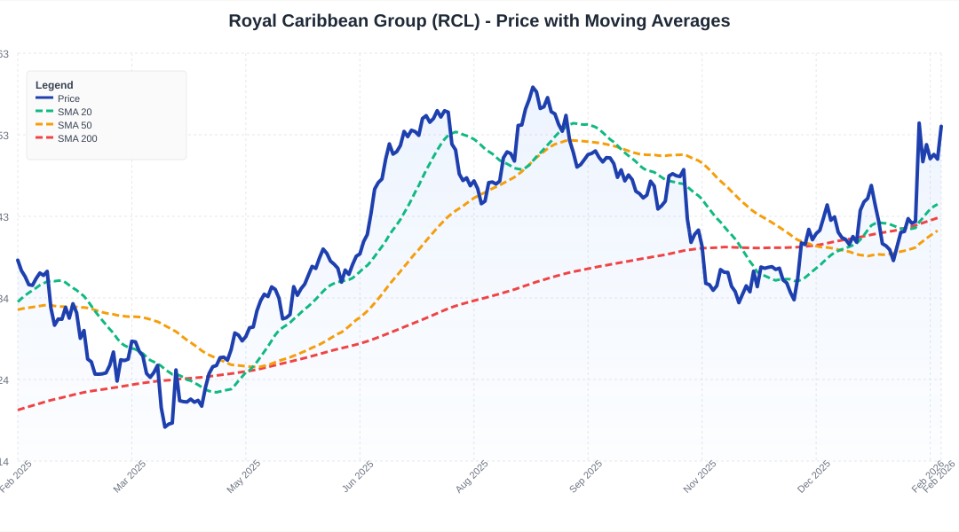 Royal Caribbean is trading 14.3% above its 20-day simple moving average (SMA) and 20.1% above its 50-day SMA, indicating strong short-term momentum.