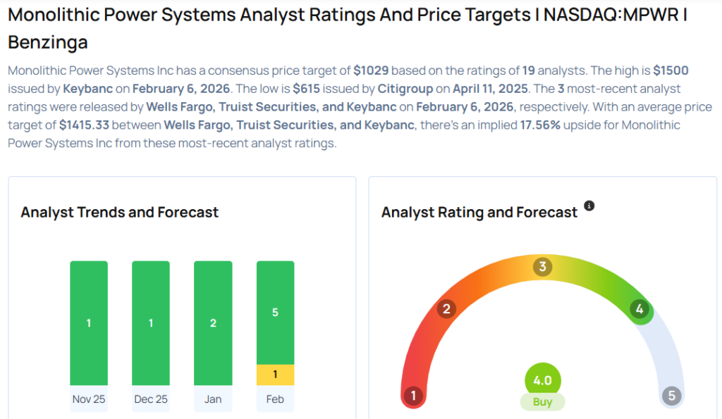 - Wells Fargo analyst Joe Quatrochi maintained Monolithic Power with an Overweight rating and raised the price target from $1,200 to $1,350.