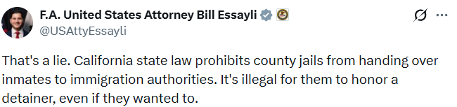 However, First Assistant U.S. Attorney Bill Essayli for the Central District of California countered that California state law “prohibits county jails from handing over inmates to immigration authorities,” calling Newsom’s claims “a lie.”