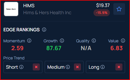 Benzinga’s Edge Rankings place Hims & Hers in the 87th percentile for growth and 7th percentile for value, reflecting its mixed performance. Benzinga’s screener allows you to compare Hims & Hers performance with its peers.