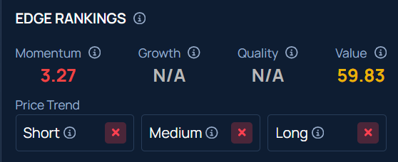 COIN stock maintains a weaker price trend in the short, medium, and long term, with an average Value ranking, according to Benzinga’s Edge Stock Rankings.