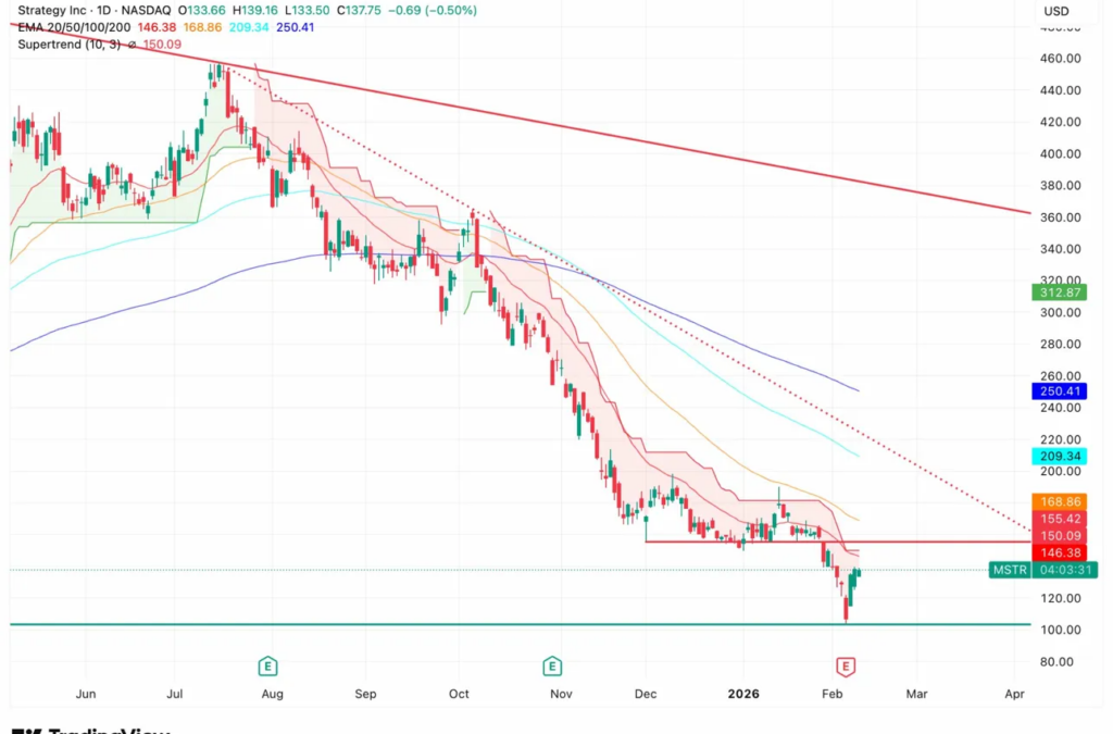 For a reversal, MSTR needs to reclaim $150-$155 and close above the 20 EMA.