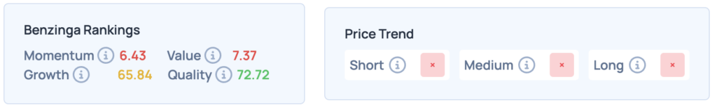 Benzinga’s Edge Rankings highlight strong quality, but weak momentum and bearish price trends across all timeframes.