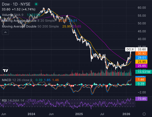 Dow Inc (NYSE:DOW) stock isn’t just bouncing — it’s pivoting. After a bruising 2025 marked by a “prolonged trough” in chemicals, Dow stock has staged a sharp cyclical rebound to around $33.60, and the chart is finally telling a different story.