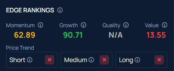 Benzinga’s Edge Stock Rankings show HOOD with weaker price momentum in short, medium, and long-term trends, offset by a strong Growth score.