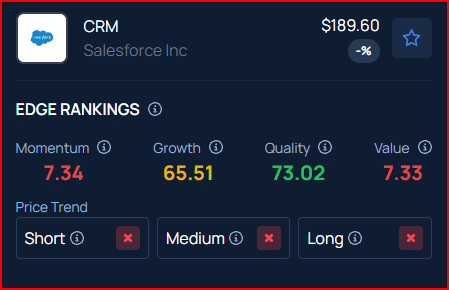 Benzinga’s Edge Rankings place CRM in the 73rd percentile for quality and the 65th percentile for growth, reflecting its average performance. Benzinga’s screener allows you to compare CRM’s performance with its peers.