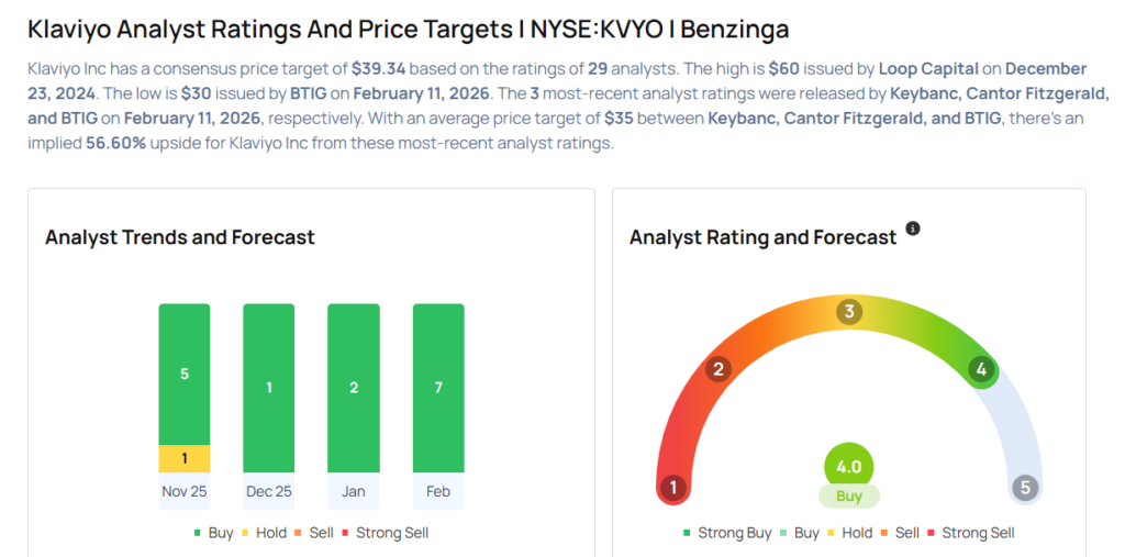 - Cantor Fitzgerald analyst Matthew Vanvliet maintained Klaviyo with an Overweight rating and lowered the price target from $40 to $35.