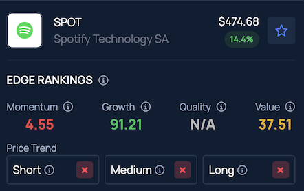 According to Benzinga Edge Stock Rankings, Spotify is showing weak price performance across short, medium and long-term time frames, with low Momentum scores overall.