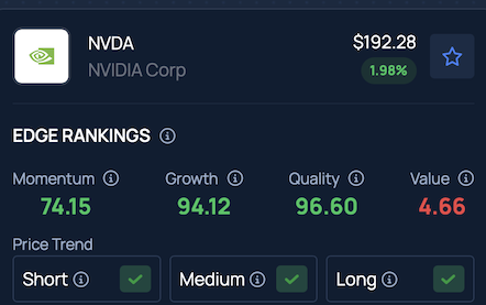 According to Benzinga Edge Stock Rankings, Nvidia continues to show a solid price trend across the short, mid and long-term time frames, though it carries a weaker score on Value metrics.