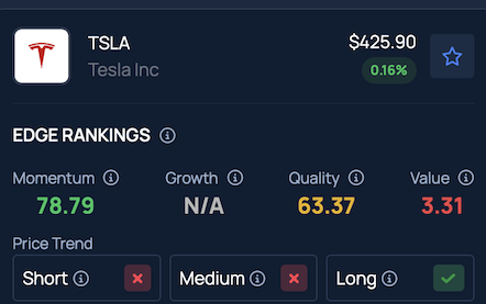 TSLA shows a strong long-term price trend but a weaker trend in the short and medium term, along with a low Value ranking, according to Benzinga’s Edge Stock Rankings.