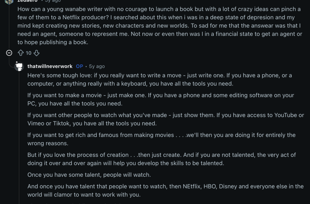 “If you want to get rich and famous from making movies… you are doing it for entirely the wrong reasons. But if you love the process of creation — then just create,” Randolph wrote.