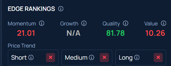 The stock maintains a weaker price trend over the short, medium, and long terms with a high Quality ranking, according to Benzinga’s Edge Stock Rankings.