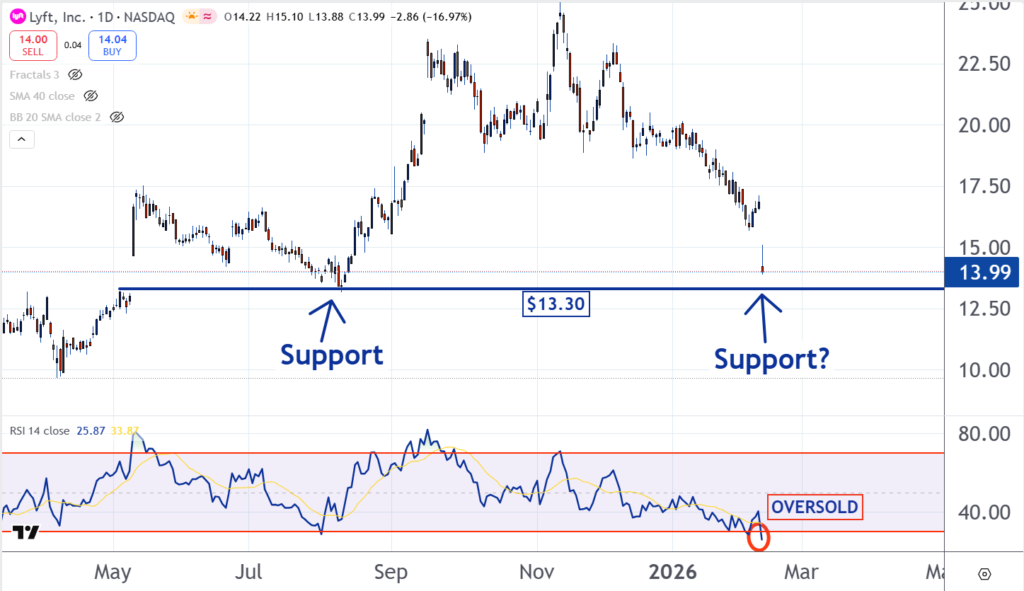It is oversold now, and it is also at support. These can be bullish dynamics, which could set the stage for a move higher. This is why Lyft is the Stock of the Day.