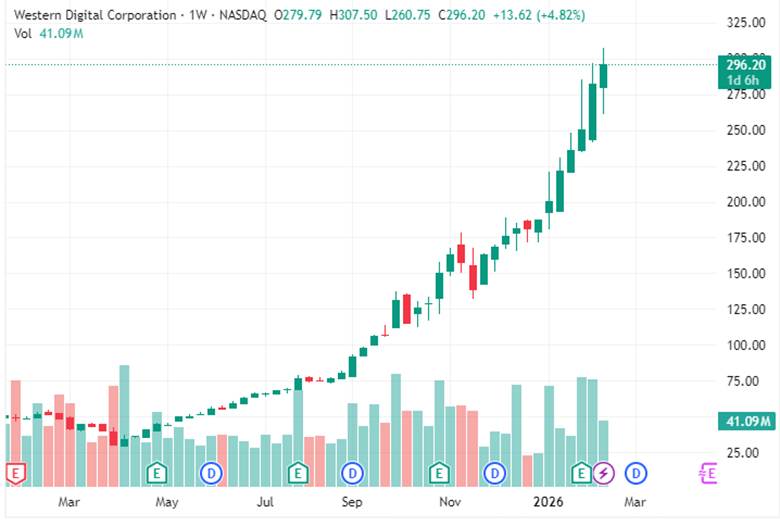 Western Digital (WDC) daily chart through February 12, 2026. The stock surged from $28.83 (April 2025 low) to an intraday high of $307.50, a 970% gain, fueled by AI storage demand, margin expansion, and spin‑off optionality. Note the vertical rally since November 2025, now testing $300 resistance.
