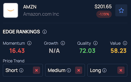 Amazon shows a weak price trend across short, medium and long-term timeframes and ranks poorly in Momentum, according to Benzinga’s Edge Stock Rankings.