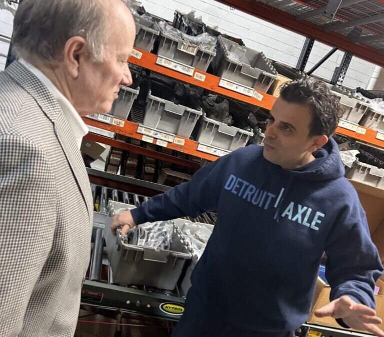Photo: Mike Musheinesh, CEO of Detroit Axle, speaking with former Detroit Mayor Mike Duggan