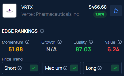 With a strong Quality score of 87.03, Benzinga’s Edge Stock Rankings indicate that VRTX has a positive price trend across all time frames.