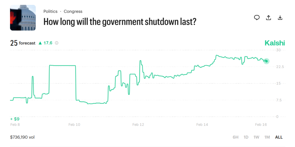 The prediction market was spot on about whether there would be a government shutdown on Valentine’s Day, with over $29 million bet on the contract.