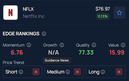 NFLX is showing a weak price trend across the short, medium and long term, along with low value and momentum scores, according to data from Benzinga’s Edge Stock Rankings.