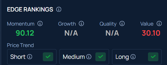 The stock maintains a stronger price trend over the short, medium, and long terms with a high Momentum ranking, according to Benzinga’s Edge Stock Rankings.